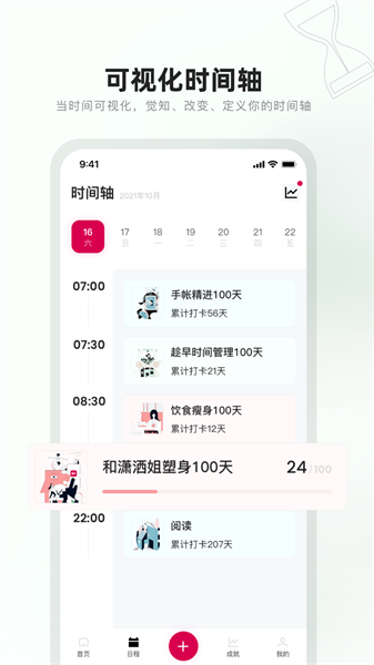 习惯打卡:极简的操作流程,3秒记录当日习惯,直观安排与定义自己的时间轴。