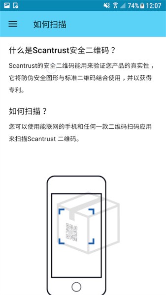 ScanTrust是可以识别ScanTrust (司诚) 防伪码的简单扫码工具,无需特定设备,鉴别真伪只需要一台智能手机即可。ScanTrust发明了无法复制的二维码,码的中心区域有个独特的安全防伪图印,由随机的点组成,只能打印一次。