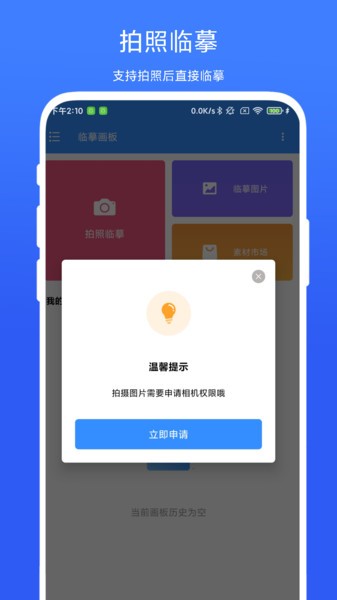临摹画板,一款可以临摹图片的APP,可以实现在用手机绘制图片时,插入参考图片进行临摹。用户可以通过拍摄一张图片、选择手机相册图片或选择素材市场里面的图片进行临摹。另外,临摹过程可以调节参考图片透明度,也可以随时切换参考图片。