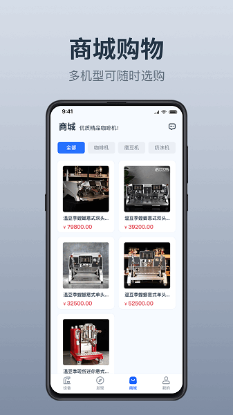 最让我觉得方便的是商城购物功能,可以直接在线买咖啡机和配件,价格透明,参数详细,想买什么一目了然。而且还能实时管理设备状态,比如保养提醒、故障报错这些都很贴心。