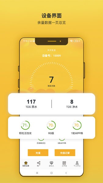 2.查看设备详情,包含水质情况,设备使用剩余天数,设备各级滤芯使用情况。