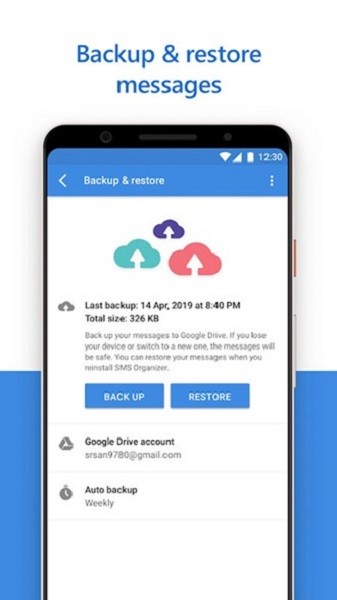 将您的消息备份到Google Drive。如果您丢失手机,切换到新手机,甚至格式化手机,您的消息都会安全。在重新安装SMS Organizer时恢复您的消息。