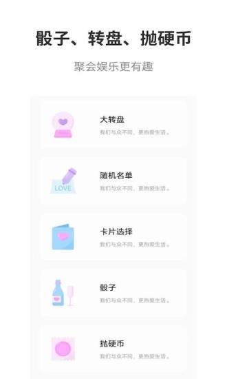 骰子、大转盘、抛硬币、随机名单、卡片选择。