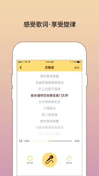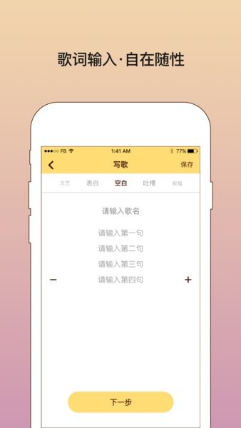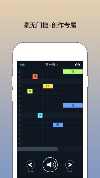 手机音乐创作工具,软件操作极其简便,用户只需在软件中输入歌词,软件便会自动生成旋律,即便你对音乐一无所知,你依然可以在这里创造出一首只需要你自己的歌曲。