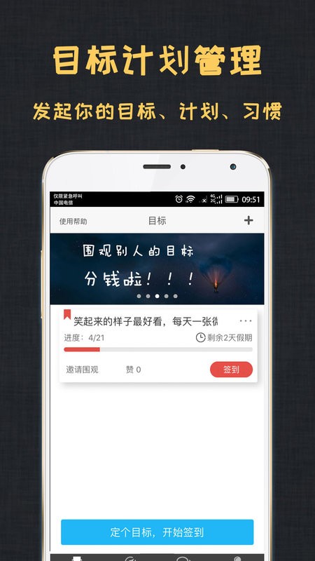专注目标管理,你可以用达目标发起一个目标计划进行打卡签到,比如早睡早起,日程管理,坚持跑步,背单词,考研,减肥健身,戒烟,坚持背单词,画画,写字,每天记账,战胜拖延症,戒王者荣耀,少逛淘宝,不玩手机,每天学习,喝水提醒,仰卧起坐,学习监督,成为学霸,时间管理,安排任务计划等等,也可以同时发起多个目标进行签到打卡。