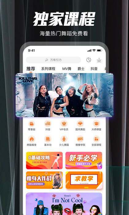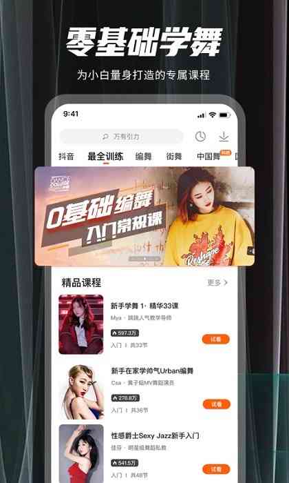 海量免费舞蹈在线课程,MTV DANCE、爵士舞、HIPHOP等等,专为零基础的你度身打造易学的流行舞蹈。