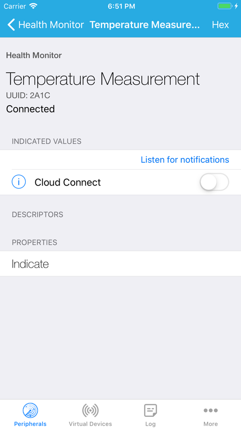 LightBlue 有两种模式,中央模式和外围模式。在中央模式下,您可以扫描并连接到您周围的所有 BLE 设备。连接后,您可以查看所有设备配置文件的详细视图,您可以从中读取和写入特征并订阅通知。