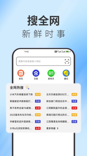 2、新闻资讯应有尽有,设计简约,占用内存小,给您功能强大的高速上网体验。