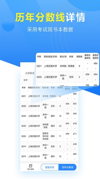 轻松查询全国2700+所大学的录取分、招生计划、师资、奖学金等信息;