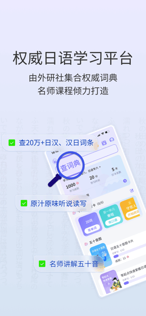 首先,它能查单词、练口语,还能欣赏和歌,了解日本文化,简直是全方位的学习体验。对于零基础的人来说,五十音图卡片简直不要太友好,发音、书写方式全都有,还有教授视频讲解,学起来 totally不费劲儿。
