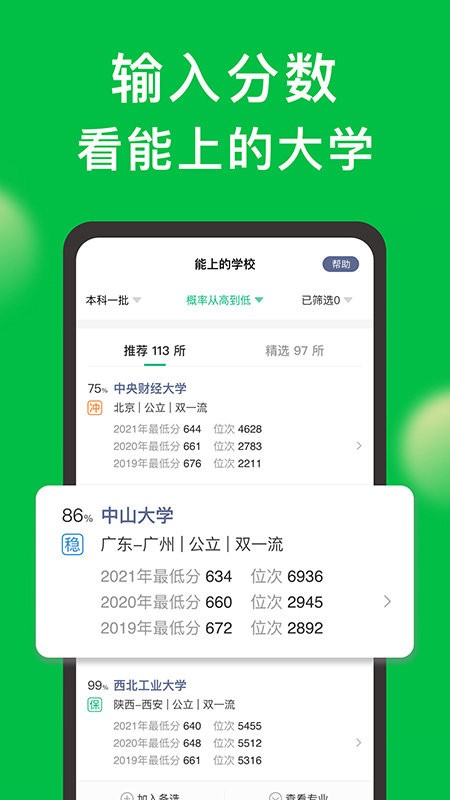 录取概率评测、志愿风险评估、能上的学校、按分数选专业、专业数据对比等超级实用功能,助你快速锁定大学和专业。
