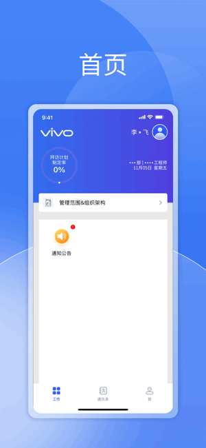 V信通 vivo版是vivo旗下员工移动数字化的办公平台,带来一站式功能服务,一键登录工号即可使用,极大便利了员工的工作,提高了效率!带来简化的工作流程,可以在线处理相关业务,掌握工作动态,随时沟通交流,跟进关键客户,提高成单率和客户满意度!