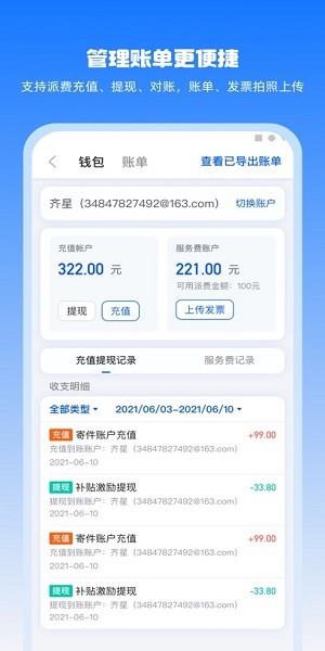支持派费充值、提现、对账,账单、发票拍照上传。