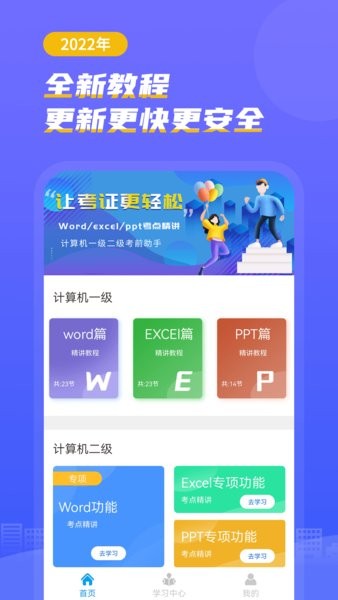 帮助考生学习计算机等级级考试,适合全国考生考前学习的计算机学习软件,涵盖了一二级ms office:word、ppt专项、excel专项等科目。直接考点,易错选择题考点教授精讲,全真模拟试题真题讲解,覆盖所考知识点,考前冲刺绝佳选择!