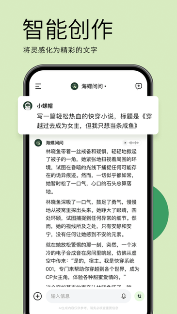 -- 智能创作:抓不住飘忽的灵感?放心,海螺问问将它们化为精彩的文字,让创意流转成篇。