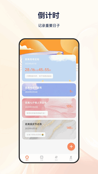 这是一款专为安卓用户设计的倒计时软件,你可以随心自定义添加一个倒计时,甜蜜的恋爱纪念日、结婚纪念日,或是亲朋好友的生日;也可以一键添加父亲节、母亲节、五一节、国庆节等节日倒计时;还有重要的高考、统考、各类考试倒计时,都可以随意添加。