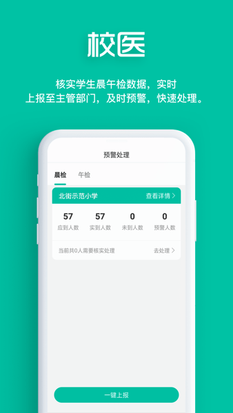 核实学生晨午检数据,实时上报至主管部门,及时预警,快速处理。