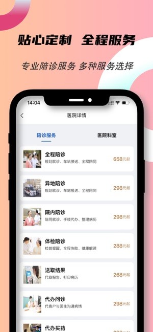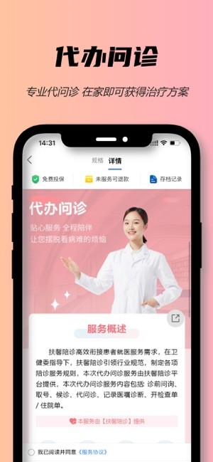 扶馨陪诊同城就医服务app是一款提供陪诊就医问诊功能的健康医疗平台,打造一站式服务软件,集全程陪诊、异地陪诊、院内陪诊、体检陪同、送取结果、代办问诊、代办买药等功能为一体,覆盖多个地区医院,一键搜索选择,贴心定制,全程陪护!