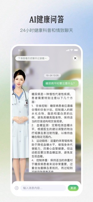 用户可根据自身健康状况,随时连线在线健康管理师,健管师团队将24小时在线解答用户各类健康问题。