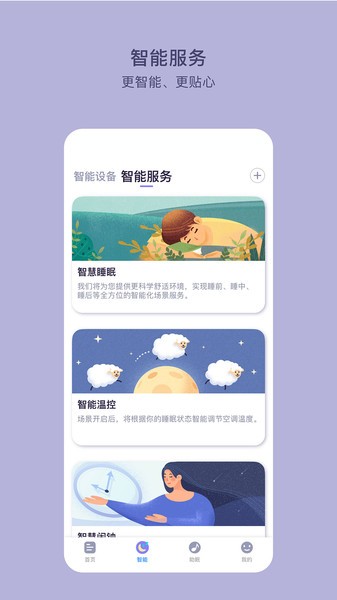 洞悉睡眠数据的智慧,根据实时的睡眠数据即时调节影响睡眠的光线、温度、湿度、味道、声音等外部因素,从视觉、嗅觉、听觉调动你的感官,令你时刻置身适宜的睡眠环境中。