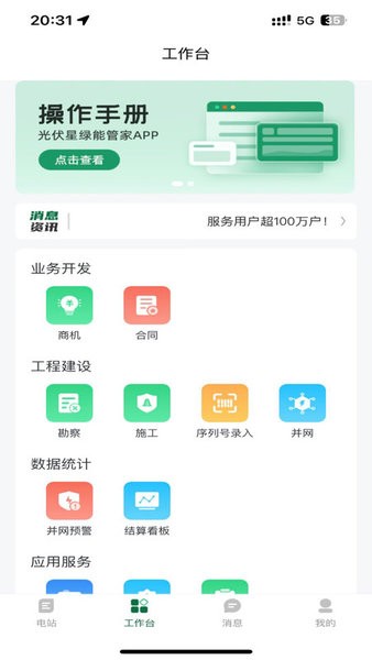 光伏星绿能管家官方版是一款提供光伏电站管理办公服务的应用软件,界面布局简单,实时更新最新消息,及时处理订单,管理客户,在线运维,统计经营数据,看起来一目了然,轻松查询,掌握收益情况,助力决策运营,高效办公,促进电站建设!