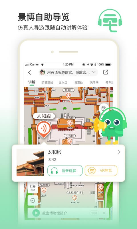 语音导览可以帮助用户在参观特定的旅游景点时获得智能景点的游玩指引,切换至后台时,仍会继续播报。景区嘈杂博物馆内也需要安静,建议带上耳机使用,收听效果更好。GPS在后台持续使用将会影响电池续航时间。