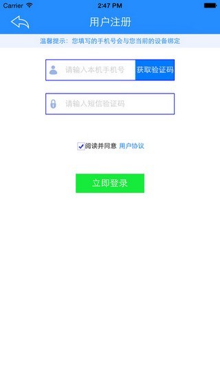 5) 如果用户第一次登录,需要用户在手机号输入框中输入手机号,并点击“获取密码”按钮后,用户手机会收到一条密码短信,用户将短信中的密码填写到短信密码输入框中;