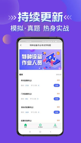 特种设备作业考试题库app是特种设备考试必备的题库软件,让用户随时都可以随时使用真题进行练习,还有许多的不同考试科目可以进行学习,在软件之中随时为用户更新全新的新题。