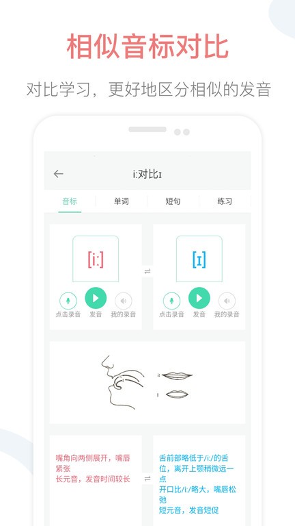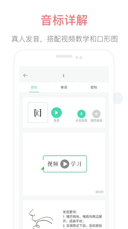 3、为用户提供详细的发音教学,让用户可以通过图文了解发音口型;