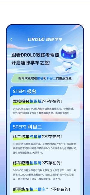 DROLO学车官方版是专门提供学车服务的驾培软件,可以在这里随时开启趣味学车之旅,帮你优选驾校,在线约车,辅助教学培训,记录练车轨迹历史和练习时长、提供练车报告,帮你攻克驾考报名和科目二的重点难题,助力考试通关!