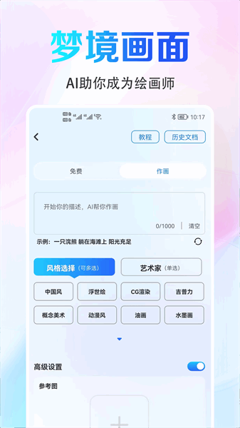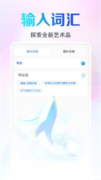 Ai画图app,使用人工智能AI艺术生成技术,输入词汇后,选择一种艺术风格,您将会看见您的想法变为现实并在几秒钟内生成伟大的艺术作品。