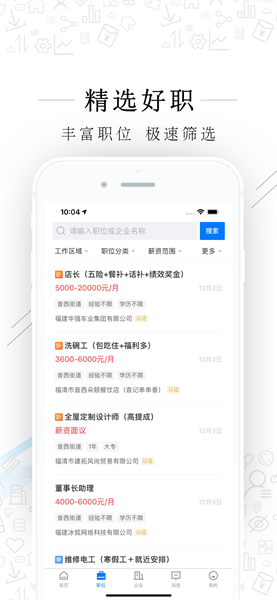 福清直聘app,一款全新的招聘求职类型的应用软件,这里有大量的工作岗位提供给大家选择,且都根据地理位置、工作内容、薪资要求等进行了详细的分类,用户可以根据自己的需求自由选择,线上与HR交流等,超级的方便好用,有需要的朋友快来下载用起来吧~