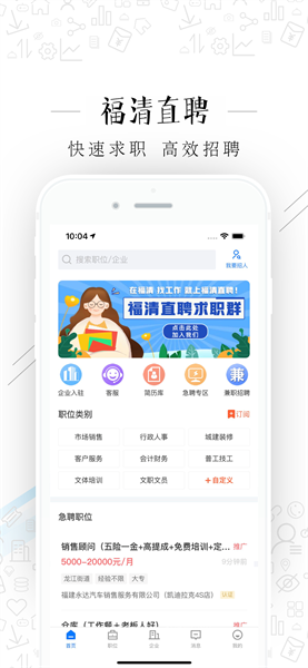 福清本地的专业求职招聘平台!福清求职招聘、找工作、招人才、寻兼职平台,福清网旗下品牌。全新招聘体验,海量简历,1v1对接,7x24响应,求职招聘快人一步。