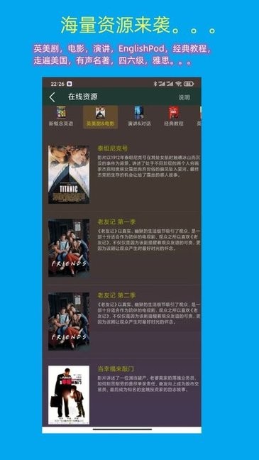 包含丰富的在线资源,新概念,美剧,电影,演讲,脱口秀,经典教程,四六级等。