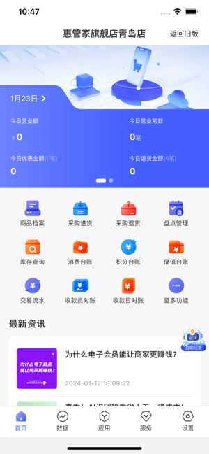 惠管家门店通官方版是为门店商家提供运营管理服务的办公化平台,集商品档案、采购进货、采购退货、盘点管理、库存查询、消费台账、积分台账、储值台账、交易流水、收款员对账等功能,最新资讯消息及时推送,统计分析数据,掌握营业和收益状态,提高效率!