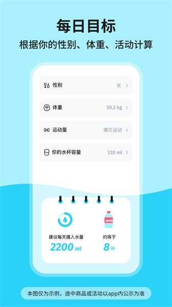 加入6个趣味性的喝水换肤功能,有熊猫森森、小兔子薇儿、小猪福福、北极熊毛毛、北极熊妮可、小狗阿奇,让爱喝水的过程不再枯燥。吨吨喝水App通过可爱的视觉元素和互动性,激励您持续关注水分摄入,享受健康生活的每一步。