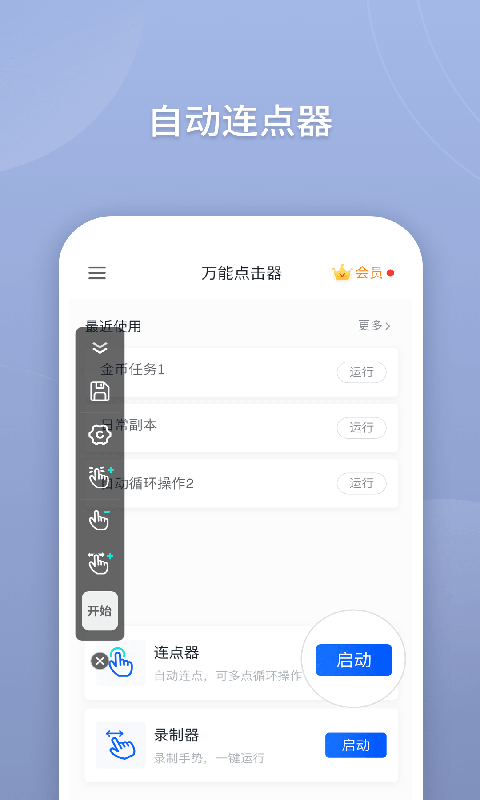 万能点击器app安卓版是一个非常实用的工具,可以完全解放你的双手!它不需要root权限就能实现各种自动点击操作,简单好用,即使是新手也能快速上手。这款软件的功能特别强大,不仅可以设置单点点击,还能录制复杂的手势,支持滑动和快捷键等多种操作方式。对于需要频繁点击、刷新或者抢单的人来说,这绝对是个神器!