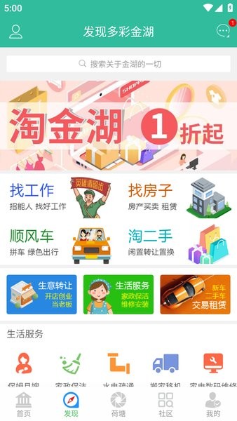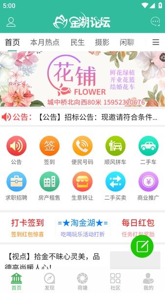 2、点击荷塘,我们可以在里面发帖、逛论坛,分享生活和了解金湖生活资讯;