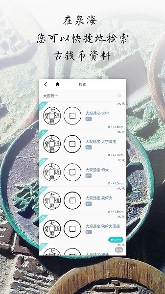 泉海,是一款古钱币资料查询软件。您可以搜索查阅历代古钱币资料,通过钱币版别图谱对自己的钱币进行版别比对,快速识别钱币版别,还可以将自己的钱币照片资料进行上传,生成钱币的对版内容。