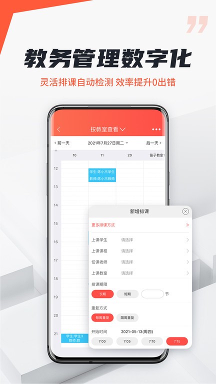 2.分班排课灵活设置规则,支持临时调课操作,自动冲突检测,轻松排课零出错;