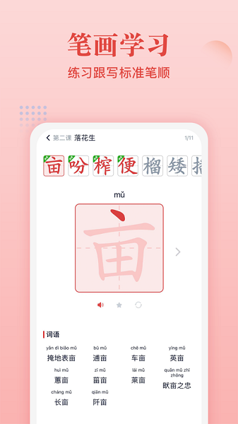 涵盖组词、成语、笔画顺序、五笔等知识问答;