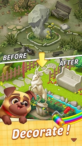 3、享受跳动花卉的乐趣,完成匹配级别的装饰,装饰客厅,厨房,花园,狗窝和其他房屋区域。