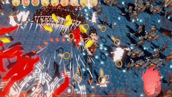 3. 击杀怪物可以获得经验,当经验条满了以后就会升级,然后就会出现三个随机的法宝,可以选择一个学习,或者强化已学的技能;