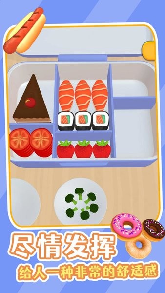 饭盒准备就绪是可以在游戏中自己制作各种食物的游戏,玩家在游戏中可以快速的进行游玩,而且游戏的操作是非常的简单,可以在游戏中快速的进行游戏,使玩家在游戏中可以自由的进行各种有趣的挑战和各种冒险,成为一个收纳大师。