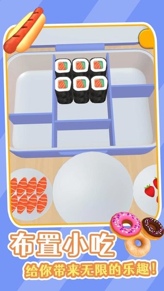 休闲益智类型有趣的游戏,在游戏中,玩家可以每天制作很多美味的食物,然后将这些食物按顺序放入餐盒。这个游戏玩起来很简单,而且非常轻松。他无聊的时候消磨时间是合适的。看到美味的饭菜心情就会变得更加的舒畅美丽哦。