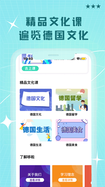 哆啦德语是为德语爱好者用心打造的德语学习软件,课程分为七个阶段;德语零基础入门发音、德语A1、A2、B1、B2、C1、C2、德福,不管是兴趣爱好、工作需要、德语考级、德语考研还是去德国留学、旅游、看德国电影歌剧、听德语歌,哆啦德语都是大家德语学习的好帮手。