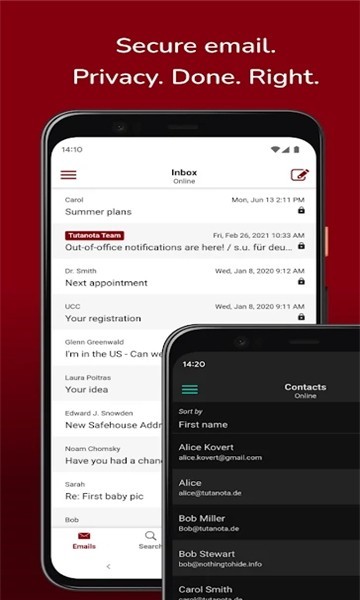 只需轻轻一点,即可使用开源应用 Tutanota 给任何人发送端到端加密邮件。即使发送的邮件未经端到端加密,您的全部通讯录也被加密存储在 Tutanota 的服务器上。您只能凭借您的密码才能访问自己的加密数据,其他人不可能对您进行剖析。Tutanota 集简单易用和安全性能于一身,这样每个人都可以使用端到端加密。现在您可以轻而易举拿回本该属于您的个人隐私!