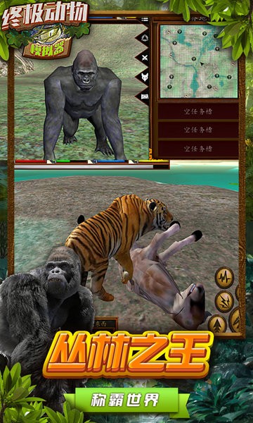 模拟丛林生物生存的3d动物模拟器,《终极动物模拟器》玩家们可以在包括猩猩、熊猫、豹子等多种生物在内的生态圈中,选择一种体验游戏,与其他物种在植被茂密的丛林中共同生活,捕猎,被捕猎,一切都有可能发生。