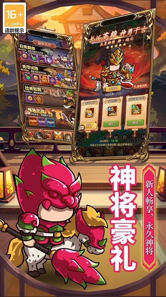人气Q版三国策略卡牌手游《神将降魔》来袭! 超级热血上百知名武将与你一同征战江山!登陆领十连,五星出保底,海量福利拿到手软,名将全揽,百抽福利狂欢盛典,超人气武将等你来!还在担心材料不够?挂机收益,不肝不氪,一键扫荡,资源无损转换助武将平步青云! 各式各样新奇玩法,上能跨服对战,下能过关斩将。