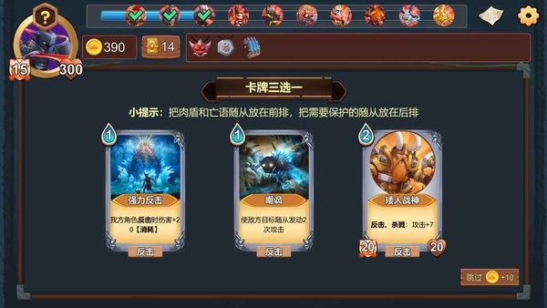 选出“越挫越勇”。(1费,消耗牌,我方反击时回5血。)